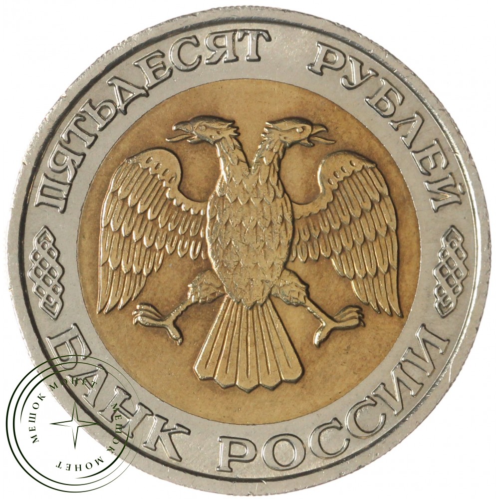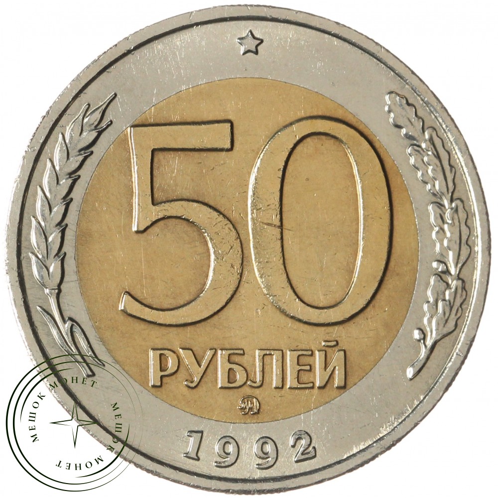 Реверс: сверху пятиконечная звезда, в центре немного смещенная вверх цифра «50» обозначающая номинал монеты, ниже слово «РУБЛЕЙ», под ним монограмма монетного двора (ММД). Внизу у края монеты год выпуска «1992». Слева колос, справа дубовая ветвь.