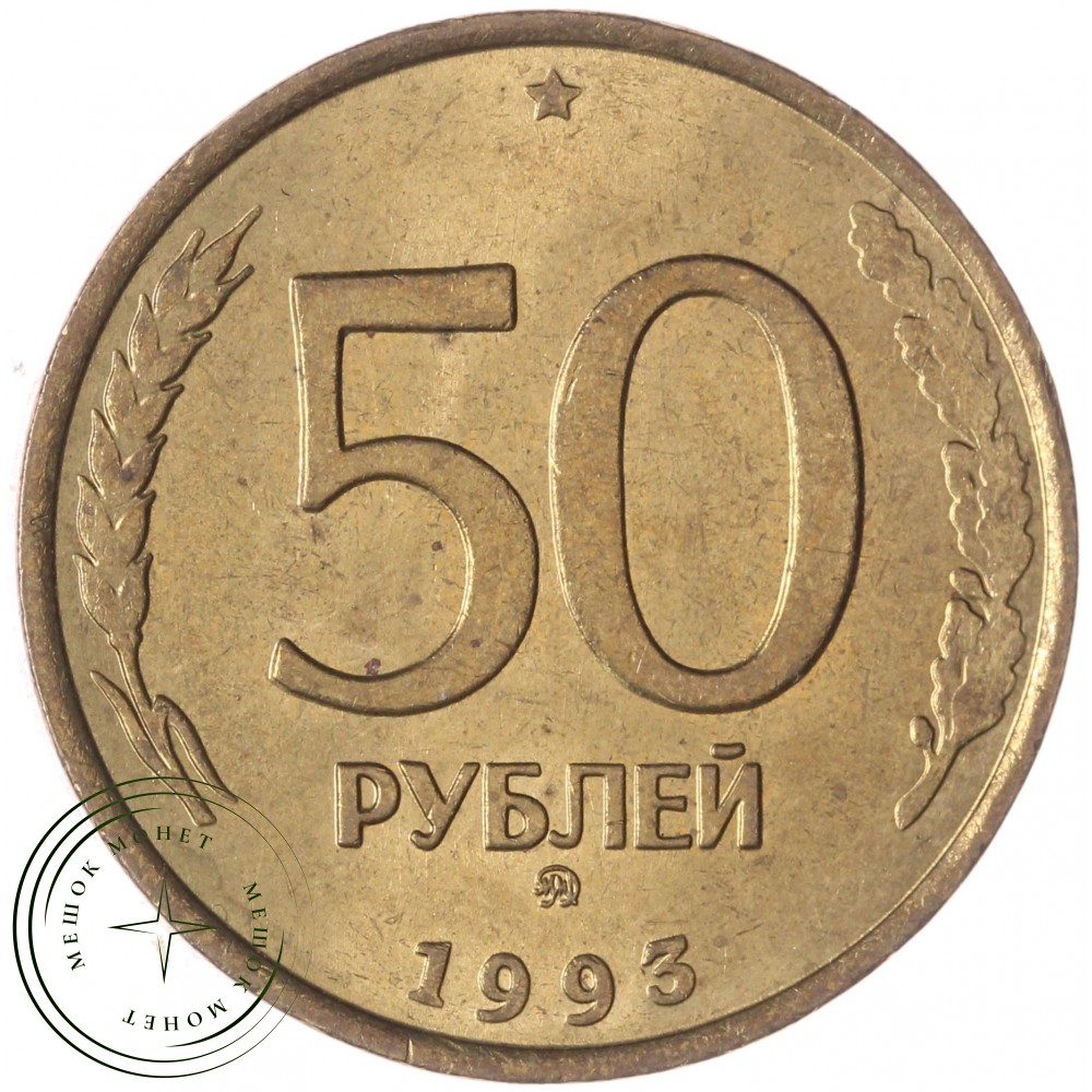 Реверс: Сверху пятиконечная звезда, в центре немного смещенная вверх цифра «50» обозначающая номинал монеты, ниже слово «РУБЛЕЙ», под ним монограмма монетного двора (ММД). Внизу у края монеты год выпуска «1993». Слева колос, справа дубовая ветвь.