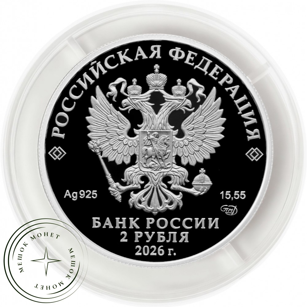 Аверс: рельефное изображение Государственного герба Российской Федерации, имеются надписи: «РОССИЙСКАЯ ФЕДЕРАЦИЯ», «БАНК РОССИИ», номинал монеты — «2 РУБЛЯ», дата − «2026 г.», обозначение металла по Периодической системе элементов Д.И. Менделеева, проба сплава, товарный знак Санкт-Петербургского монетного двора и масса драгоценного металла в чистоте.