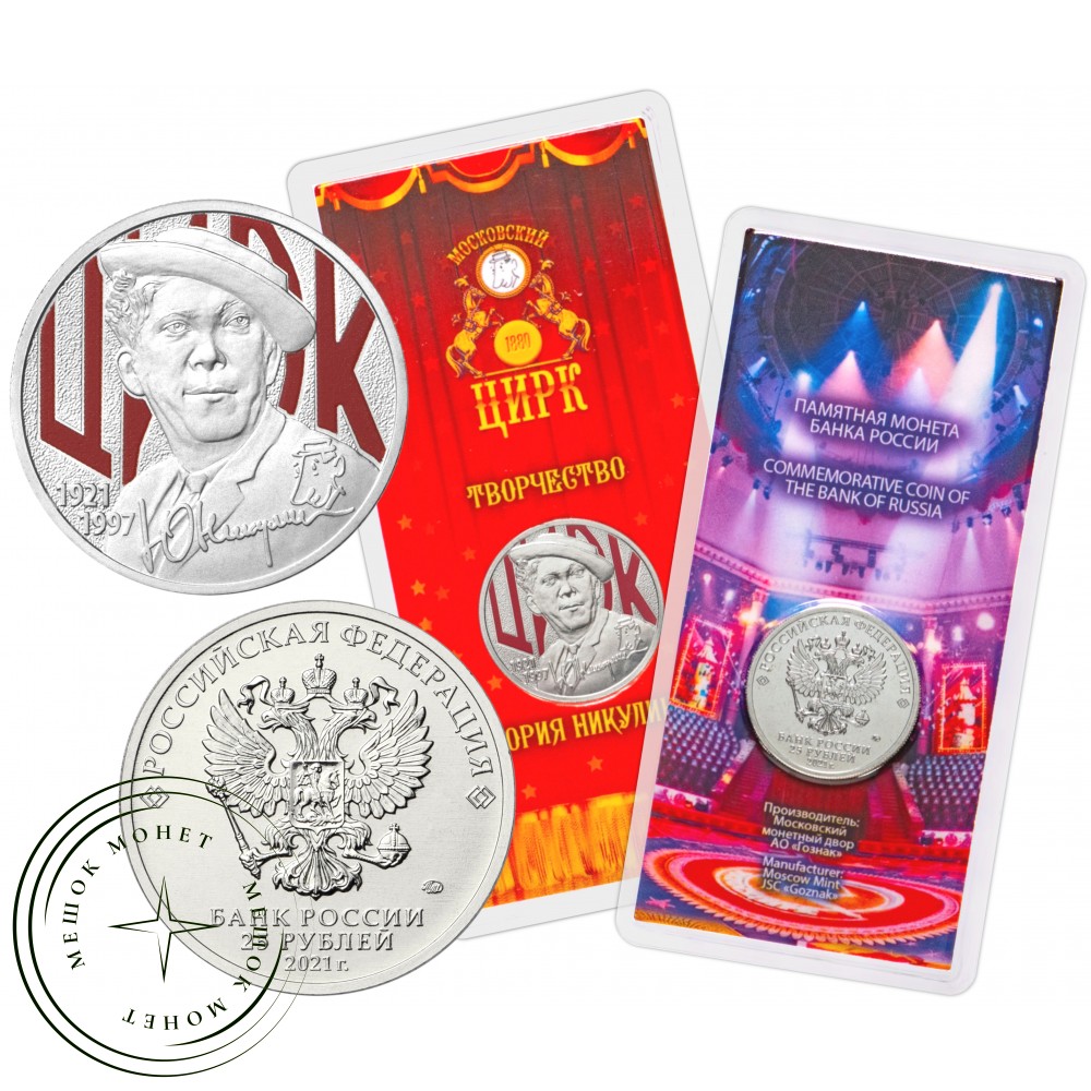 Реверс: расположено рельефное изображение портрета Юрия Никулина на фоне выполненной в цвете надписи «ЦИРК», внизу — изображение автографа артиста и годы жизни в две строки: «1921» и «1997».