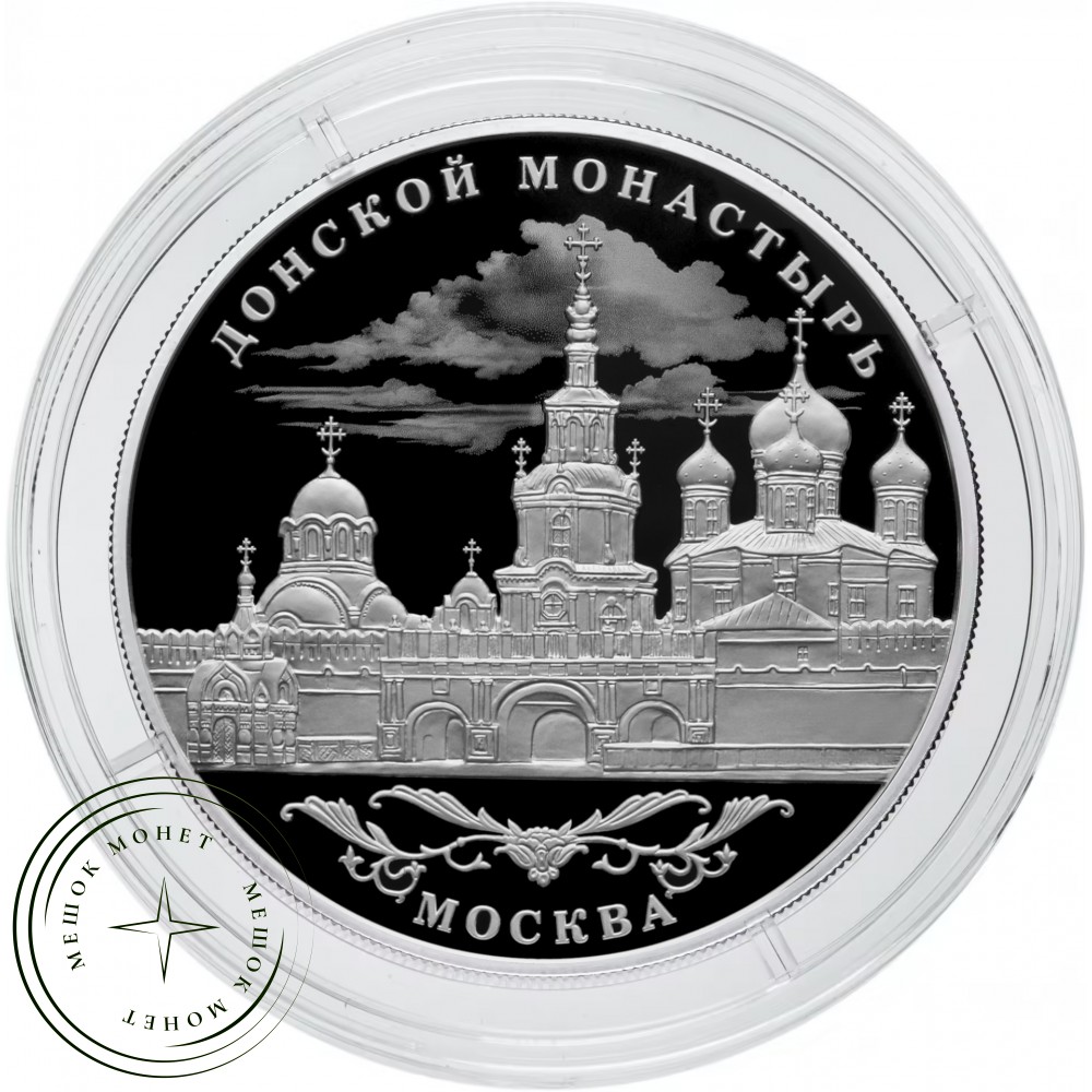 Реверс: рельефное изображение Донского монастыря на фоне изображения облаков, выполненного в технике лазерного матирования; по окружности имеются надписи: вверху – «ДОНСКОЙ МОНАСТЫРЬ», внизу, под рельефным орнаментом, – «МОСКВА».