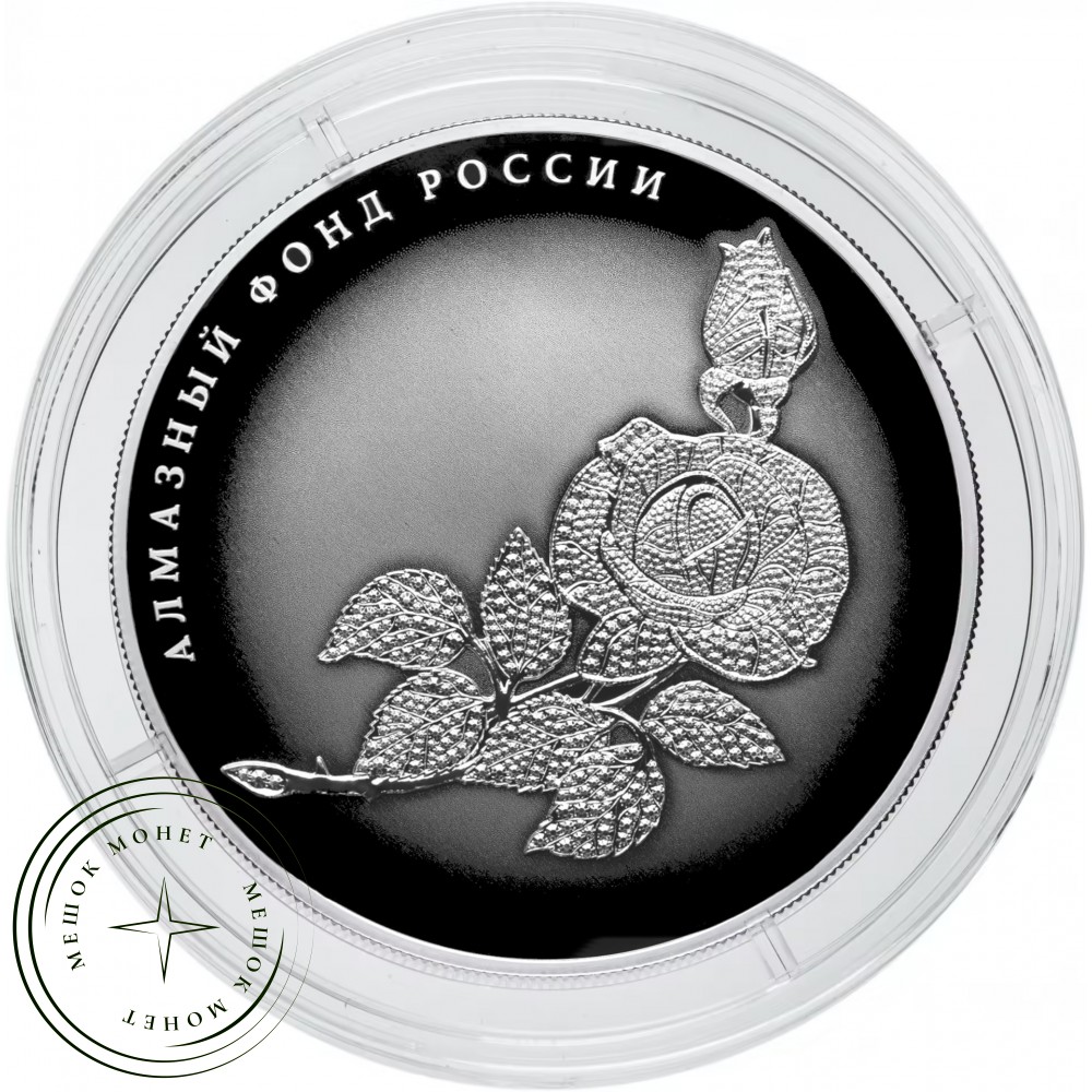 Реверс: рельефное изображение броши «Роза»; вверху слева по окружности – надпись «АЛМАЗНЫЙ ФОНД РОССИИ».