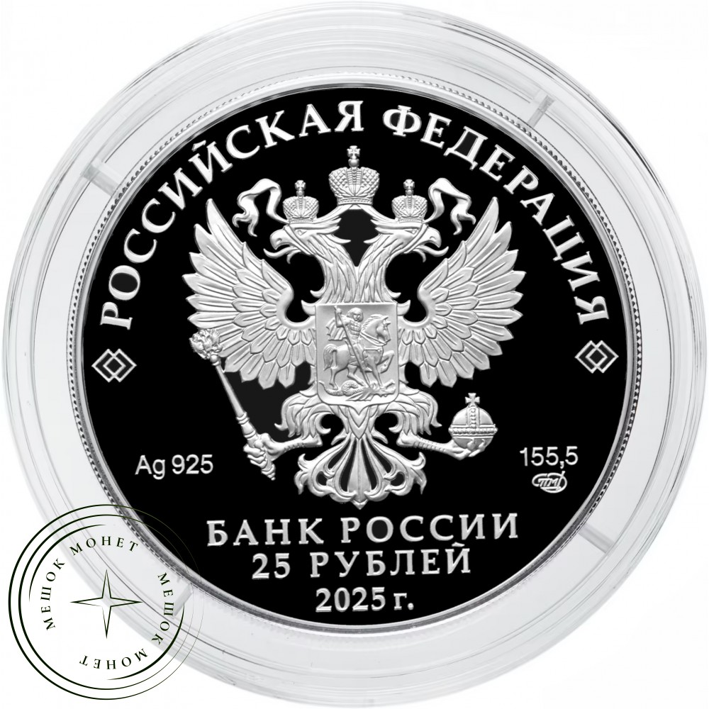 Аверс: расположено рельефное изображение Государственного герба Российской Федерации, имеются надписи: «РОССИЙСКАЯ ФЕДЕРАЦИЯ», «БАНК РОССИИ», номинал монеты: «25 РУБЛЕЙ», дата: «2025 г.», обозначение металла по Периодической системе элементов Д.И. Менделеева, проба сплава, товарный знак Санкт-Петербургского монетного двора и масса драгоценного металла в чистоте.