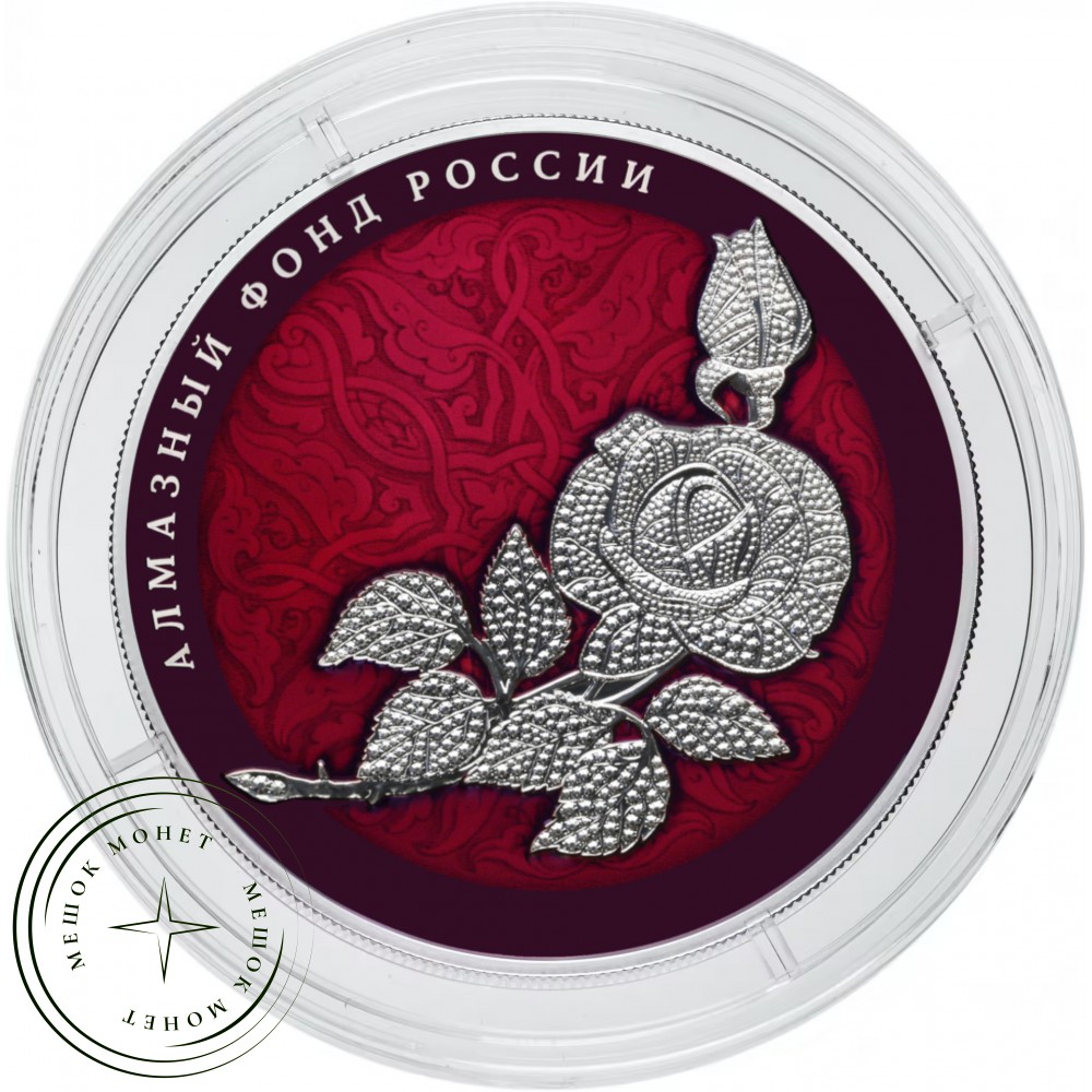 Реверс: рельефное изображение броши «Роза» на фоне фрагмента традиционного древнерусского орнамента, выполненного в цвете и в технике лазерного матирования; вверху слева по окружности – надпись «АЛМАЗНЫЙ ФОНД РОССИИ».