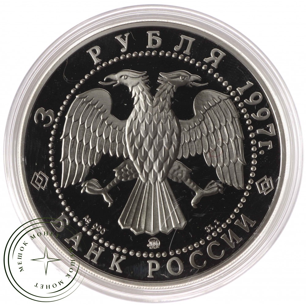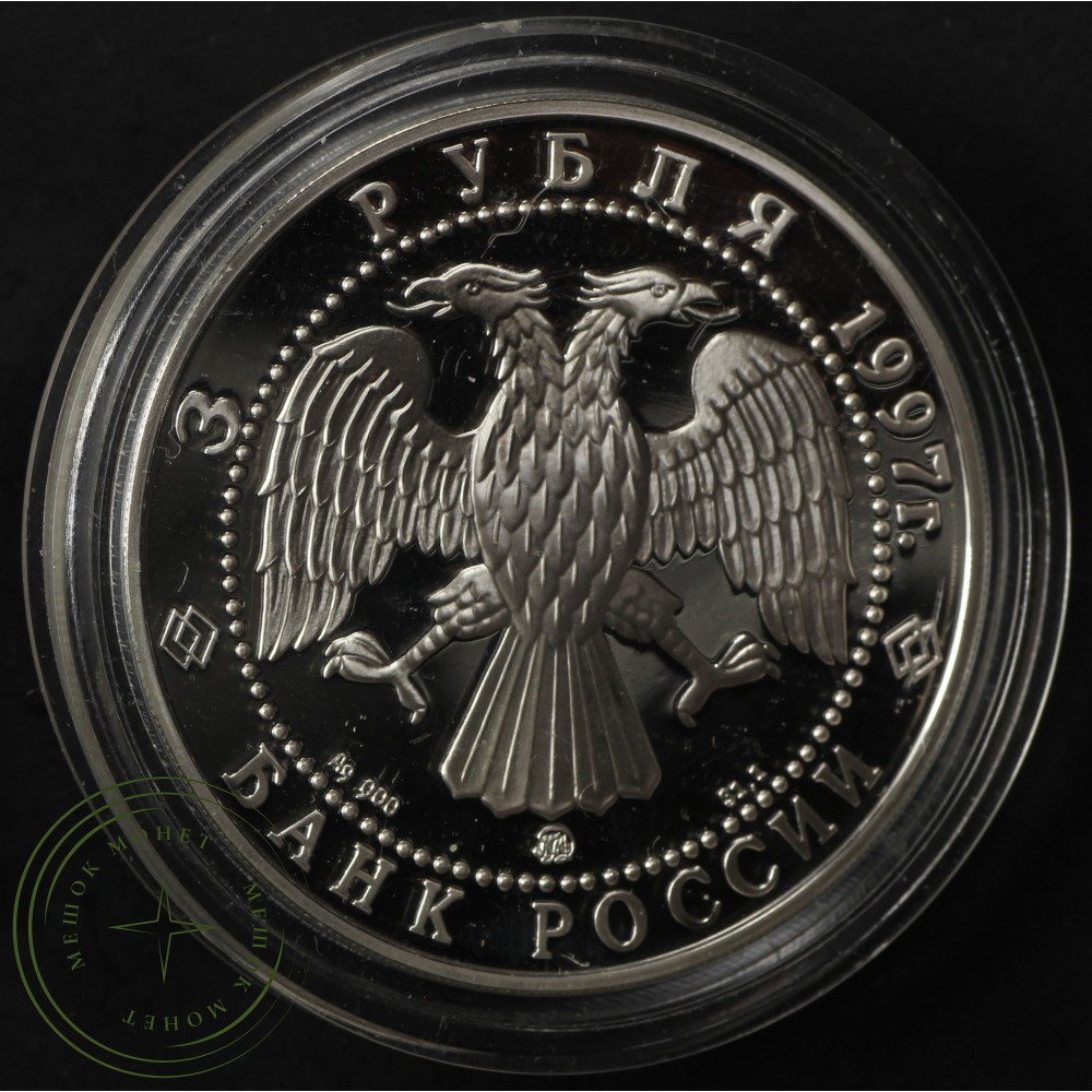 Аверс: изображение двуглавого орла , по кругу надписи: вверху — «3 РУБЛЯ 1997 г.», внизу — «БАНК РОССИИ». В нижней части — обозначение металла, проба сплава, содержание драгоценного металла в чистоте и товарный знак монетного двора.