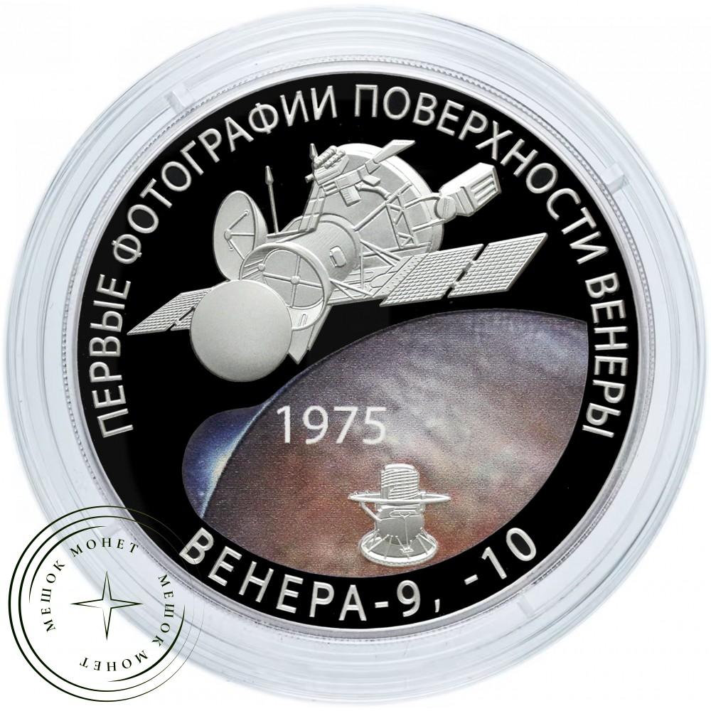 Реверс: рельефные изображения автоматической межпланетной станции «Венера-9» и спускаемого аппарата на фоне цветного изображения Венеры; имеются надписи: по окружности – «ПЕРВЫЕ ФОТОГРАФИИ ПОВЕРХНОСТИ ВЕНЕРЫ» и «ВЕНЕРА-9, -10», в центральной части – «1975».