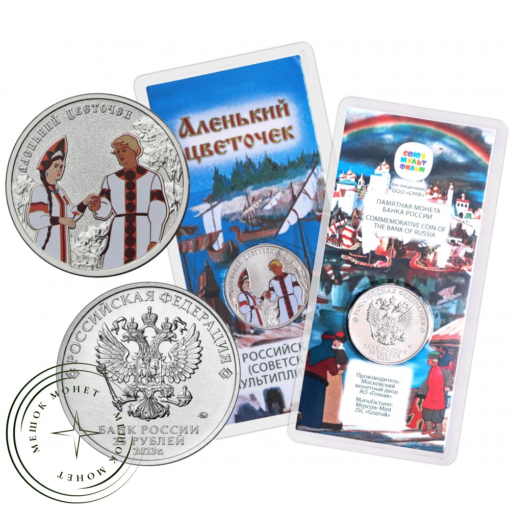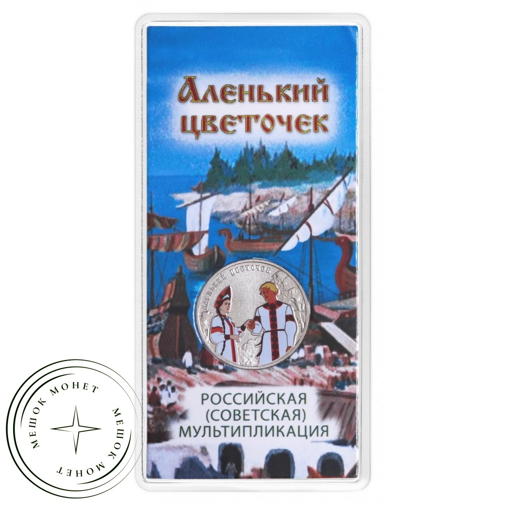 Реверс: выполненное в рельефе и цвете изображение сцены из мультфильма «Аленький цветочек»; вверху слева по окружности имеется рельефная надпись: «АЛЕНЬКИЙ ЦВЕТОЧЕК».