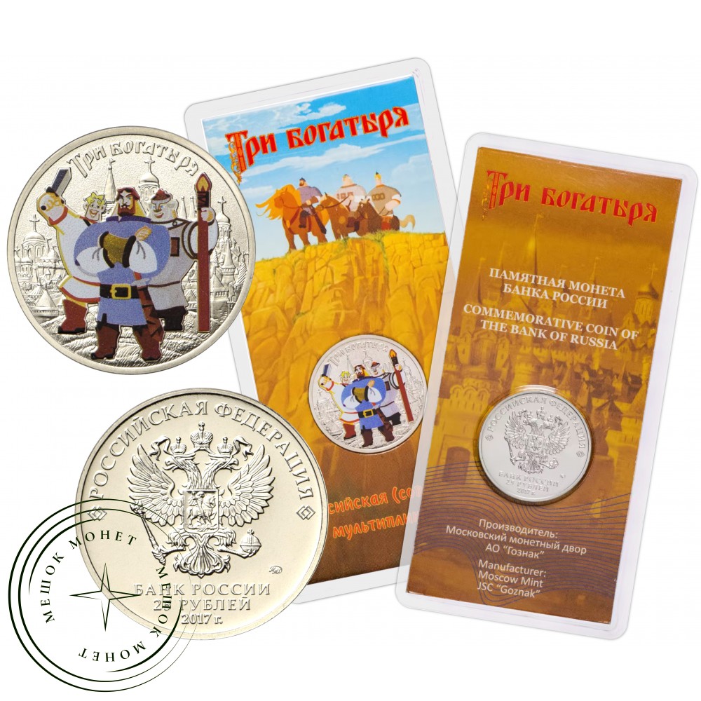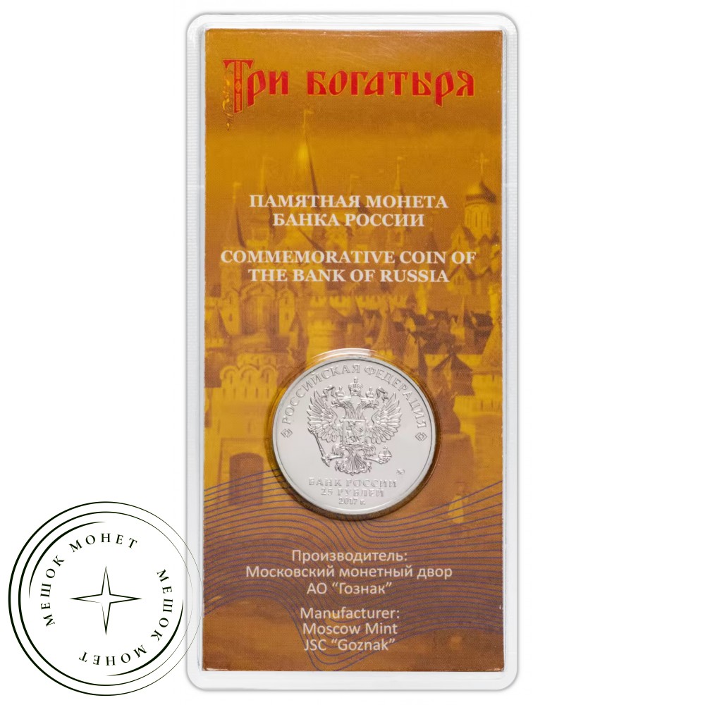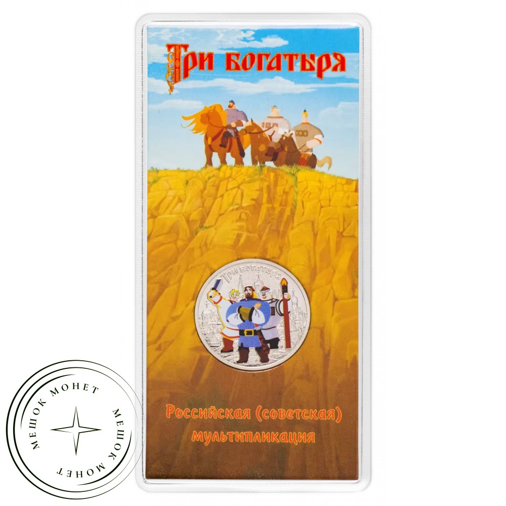 Реверс: выполненное в цвете изображение трех богатырей на фоне рельефного изображения древнего города, вверху по окружности имеется надпись «Три богатыря»