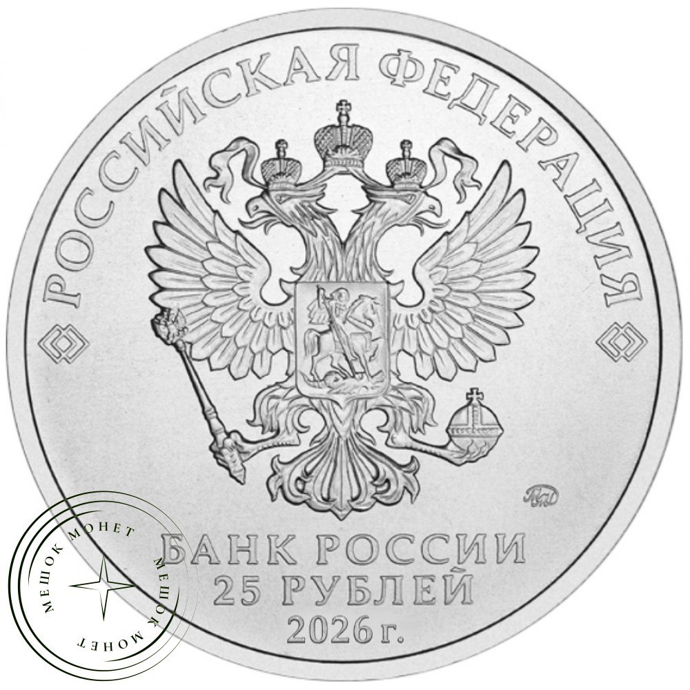 Аверс: на матовом поле диска – рельефное изображение Государственного герба Российской Федерации, над ним вдоль канта – надпись полукругом: "РОССИЙСКАЯ ФЕДЕРАЦИЯ", внизу под гербом в центре в три строки надпись: "Банк России", номинал монеты: "25 РУБЛЕЙ" и дата: "2026 г.", справа – товарный знак монетного двора.