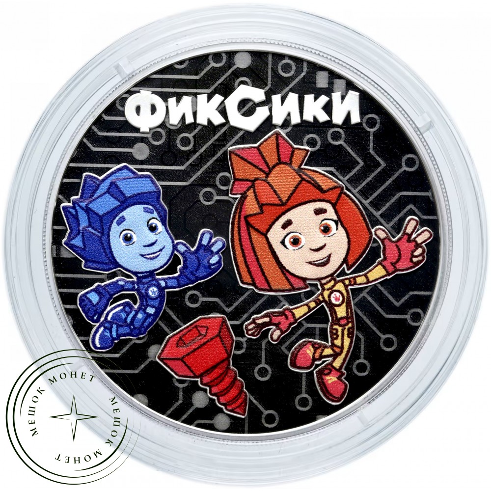 Реверс: выполненное в цвете изображение персонажей Симка (оранжевый) и Файер (синий) из мультфильма «Фиксики»; вверху слева по окружности имеется рельефная надпись: «Фиксики».