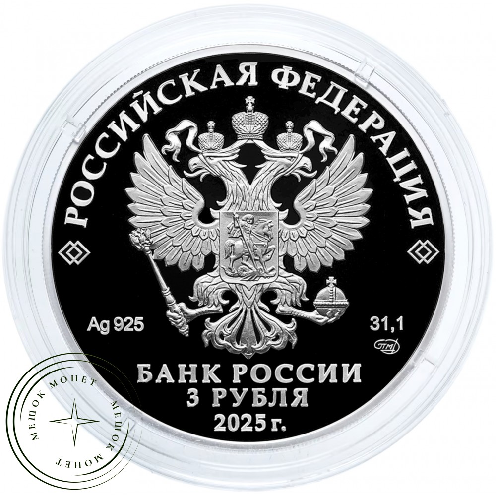 Аверс: в центре диска — рельефное изображение Государственного герба Российской Федерации (двуглавый орел, поднявший вверх распущенные крылья. Орел увенчан двумя малыми коронами и — над ними — одной большой короной, соединенными лентой. В правой лапе орла — скипетр, в левой — держава. На груди орла, в щите — всадник в плаще на коне, поражающий копьем опрокинутого навзничь и попранного конем дракона), вверху вдоль канта — надпись полукругом: "РОССИЙСКАЯ ФЕДЕРАЦИЯ", обрамленная с обеих сторон орнаментом в виде сдвоенных ромбов, в нижней части диска надписи, слева от гербового орла — обозначающие вид металла и пробу сплава, справа — содержание металла в чистоте и товарный знак монетного двора, внизу у канта — горизонтальная надпись: "3 РУБЛЯ", под ней — дата: "2025 г.".
