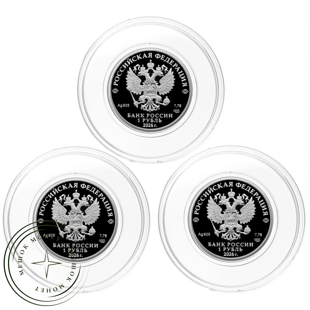 Аверс обеих монет: рельефное изображение Государственного герба Российской Федерации, имеются надписи: «РОССИЙСКАЯ ФЕДЕРАЦИЯ», «БАНК РОССИИ», номинал монеты — «1 РУБЛЬ», дата — «2026 г.», слева — обозначение металла по Периодической системе элементов Д.И. Менделеева, и проба сплава, справа — товарный знак монетного двора и масса драгоценного металла в чистоте.