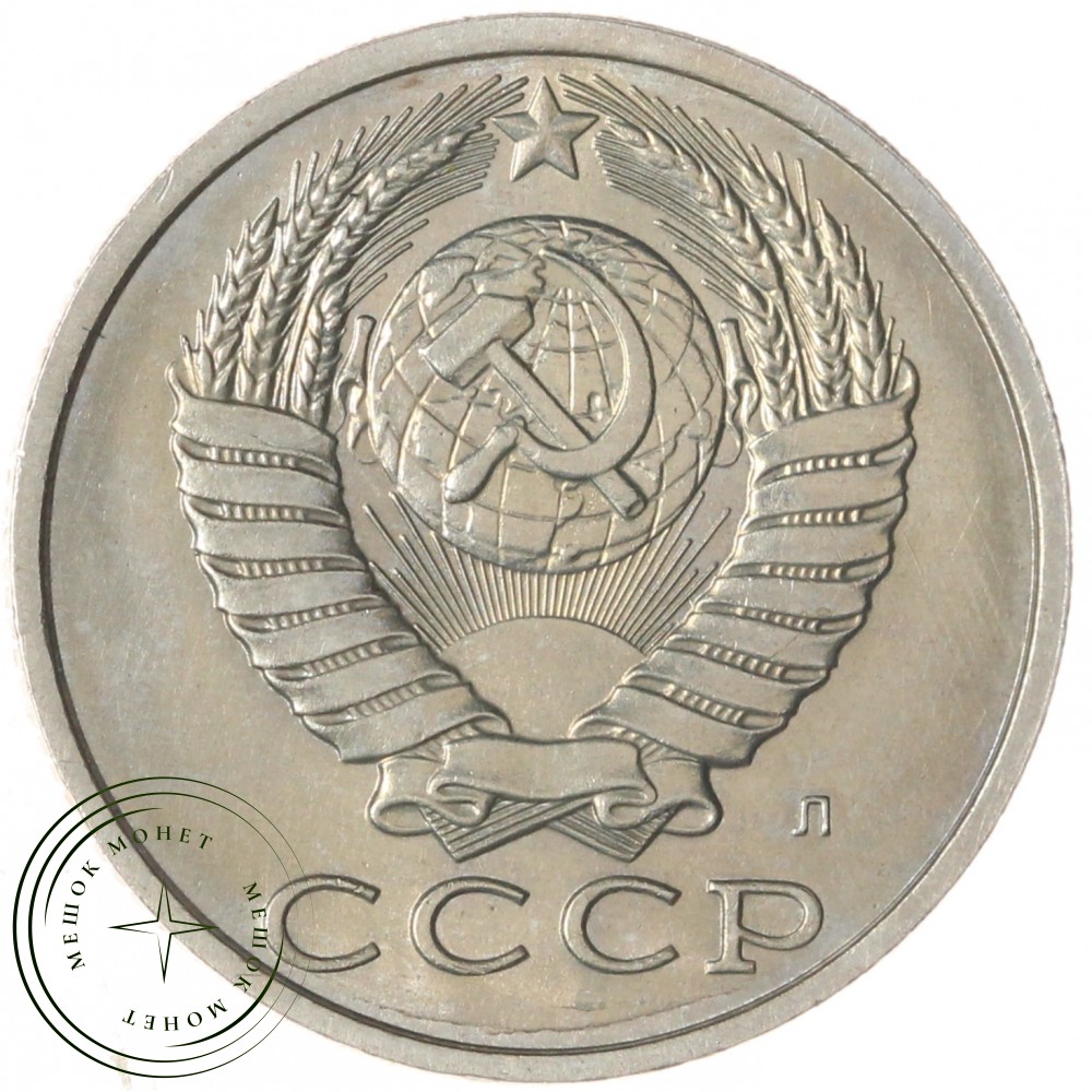 Аверс монеты состоит из изображения герба Союза Советских Социалистических Республик (СССР), с четырнадцатью витками лент, плюс одна общая, снизу по центру. Внизу надпись СССР. Под гербом, cправа, присутствует литера "Л", которая указывает на монетный двор, где была выпущена монета, в данном случае это Ленинградский монетный двор.