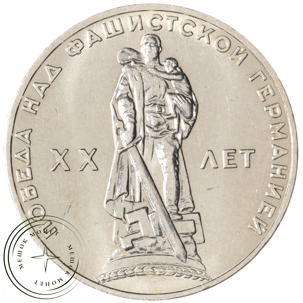 Памятная монета номиналом 1 рубль посвященная 20-летию победы над фашисткой Германией. Состояние: AU.