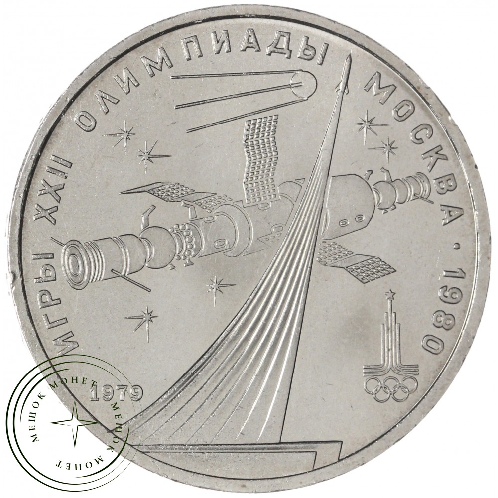 Реверс: в центре изображен монумент в ознаменование выдающихся достижений советского народа в освоении космического пространства на фоне первого искусственного спутника Земли и орбитального научно-исследовательского комплекса в космосе, внизу: слева дата «1979», обозначающая год чеканки, справа эмблема Олимпийских игр 1980 г. По окружности надпись «ИГРЫ XXII ОЛИМПИАДЫ МОСКВА — 1980».