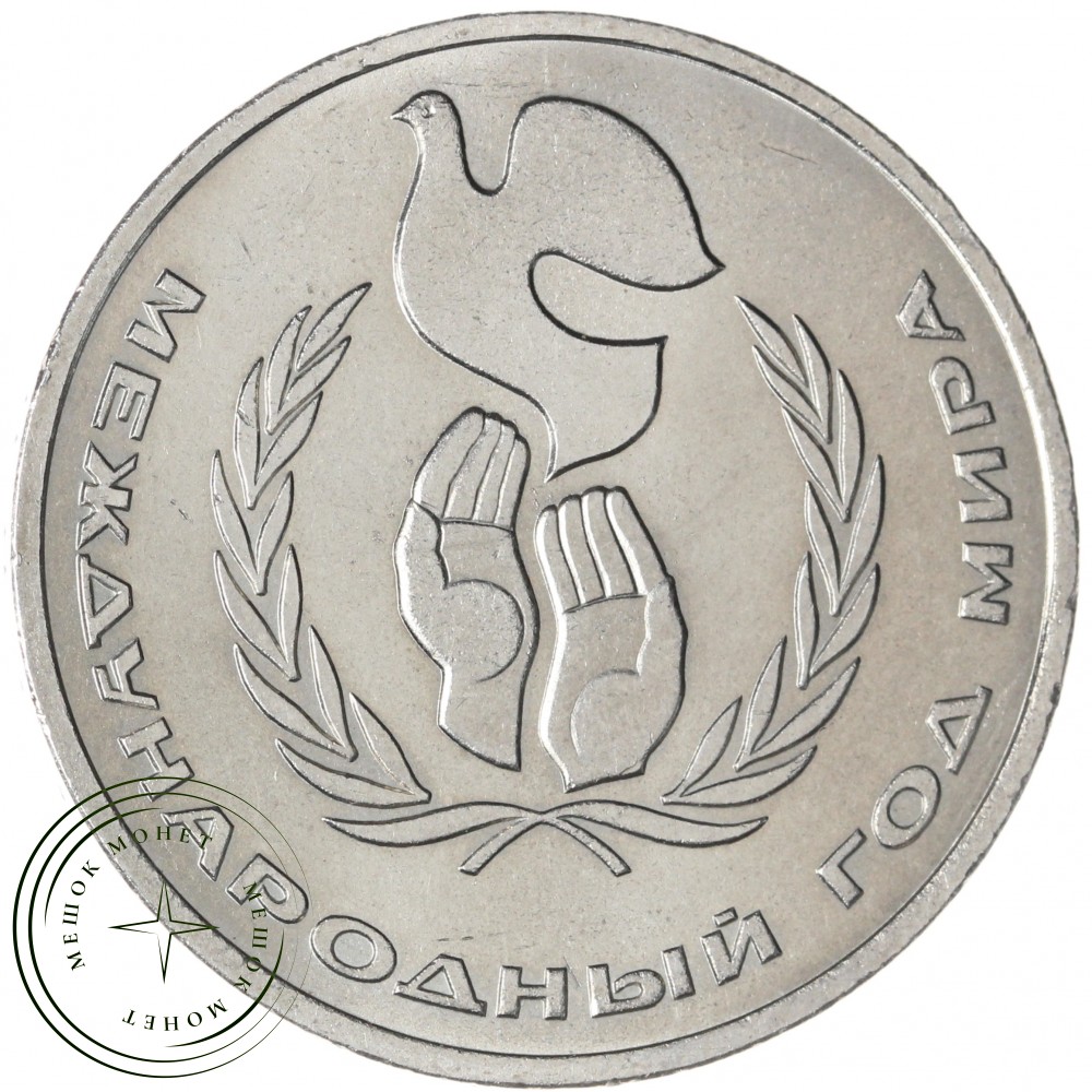 Реверс: В центре изображение эмблемы Международного года мира. В нижней части полукругом надпись «МЕЖДУНАРОДНЫЙ ГОД МИРА».
