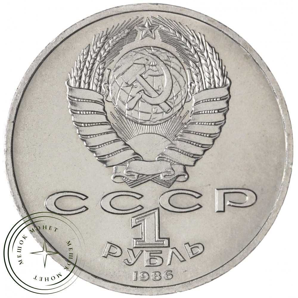 Аверс: Сверху герб СССР с 15 витками ленты, под ним буквы «СССР», ниже обозначение достоинства монеты цифра «1» и ниже слово «РУБЛЬ», внизу у канта год выпуска монеты «1986».
