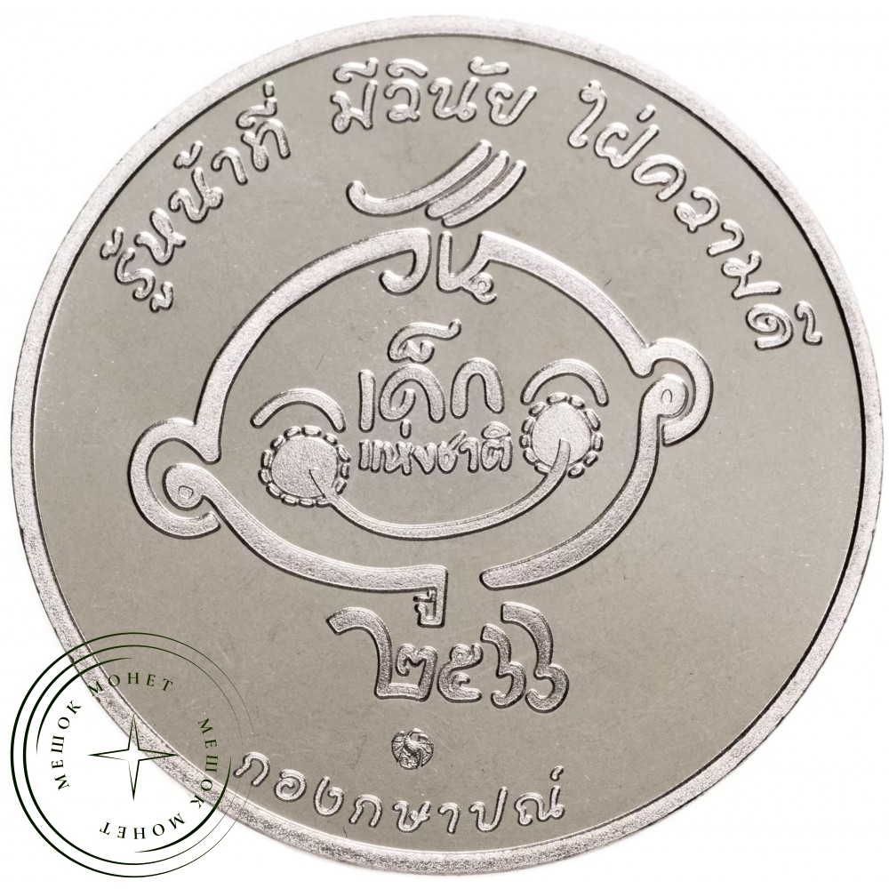 Надписи на жетоне содержат фразу "รู้หน้าที่ มีวินัย ใฝ่ความดี", что переводится как "Знать свой долг, быть дисциплинированным, стремиться к добру", а также "เด็ก แห่งชาติ", что означает "Национальный ребенок" или "День защиты детей". "กองกษาปณ์" указывает на монетный двор.