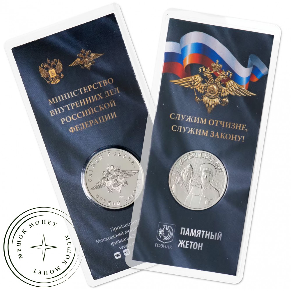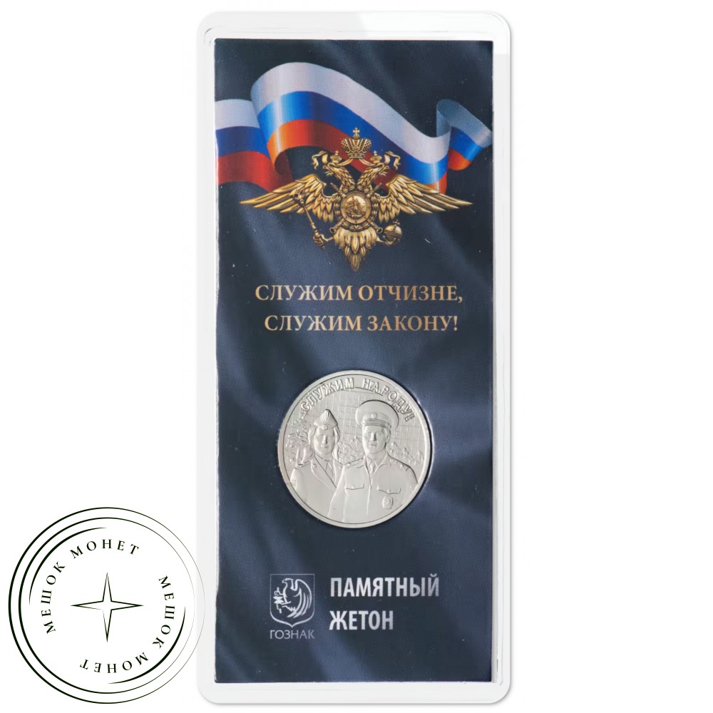 На жетоне с другой стороны изображены сотрудники МВД и надпись «Служим народу».